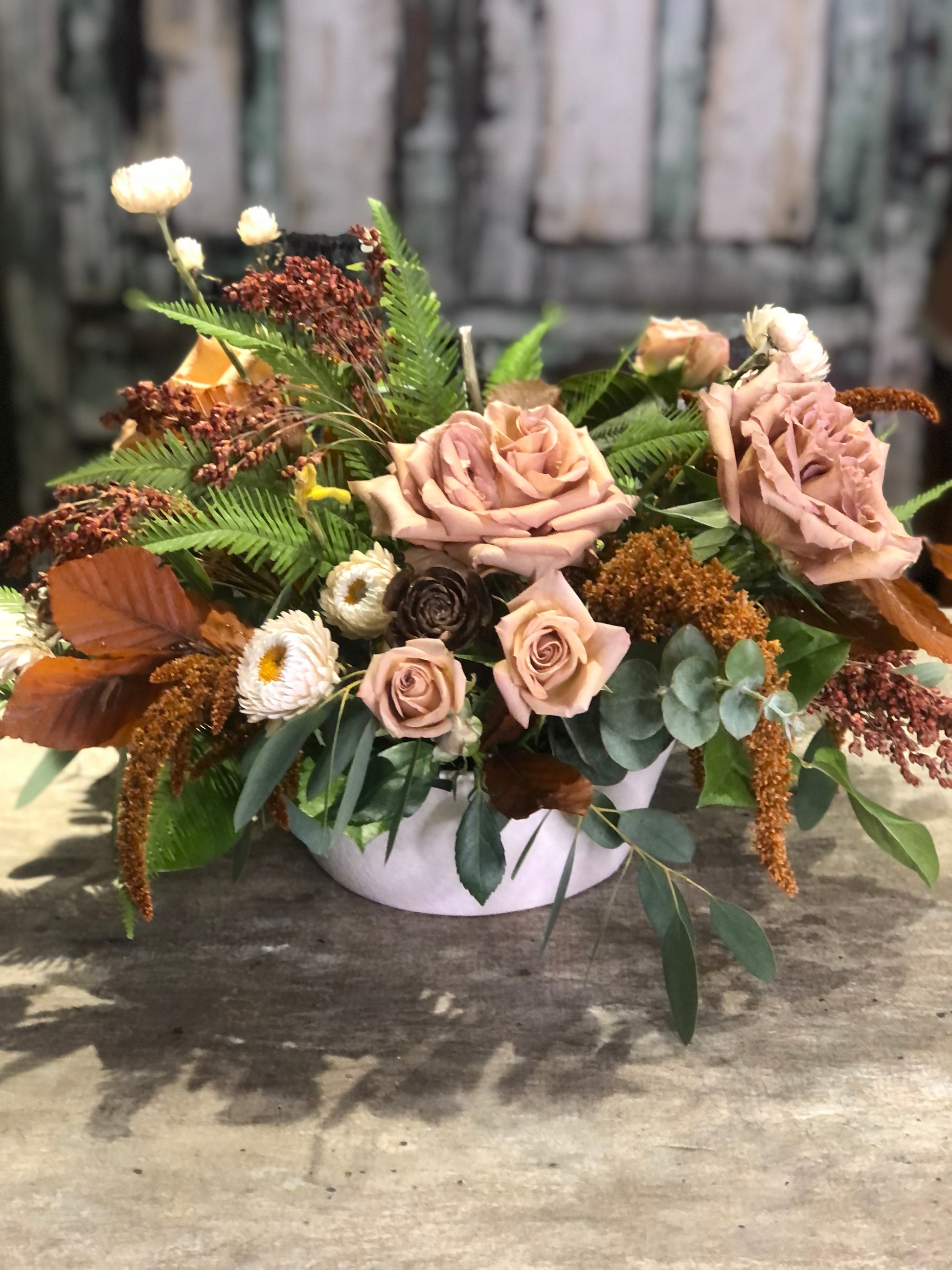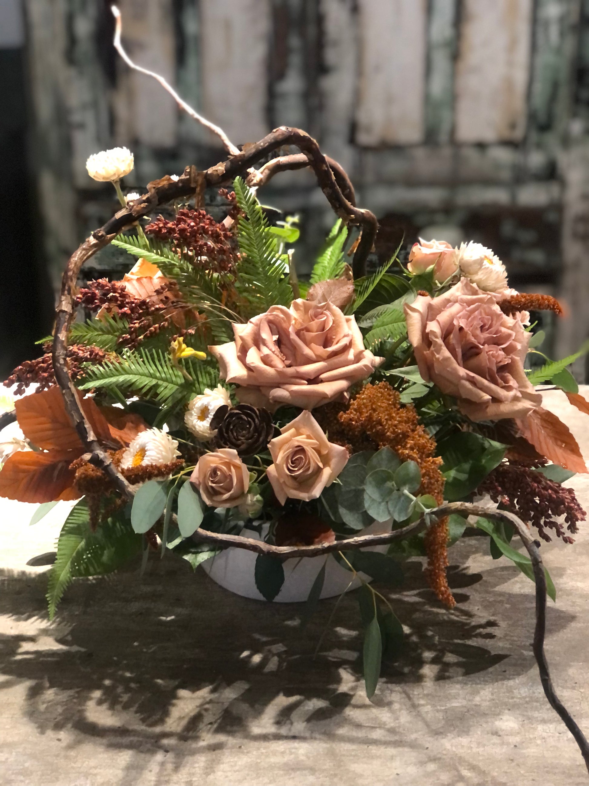 It features earth spray roses and toffee roses complimented with forest feel textures. A great PNW that will compliment any table.