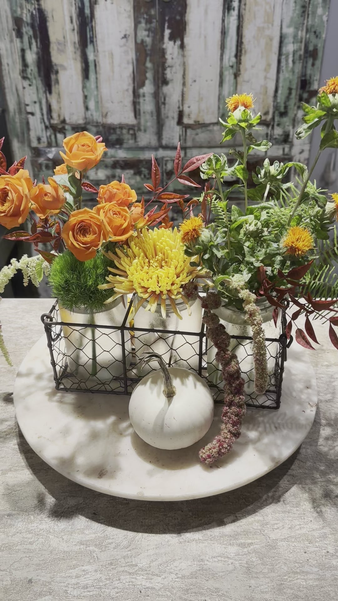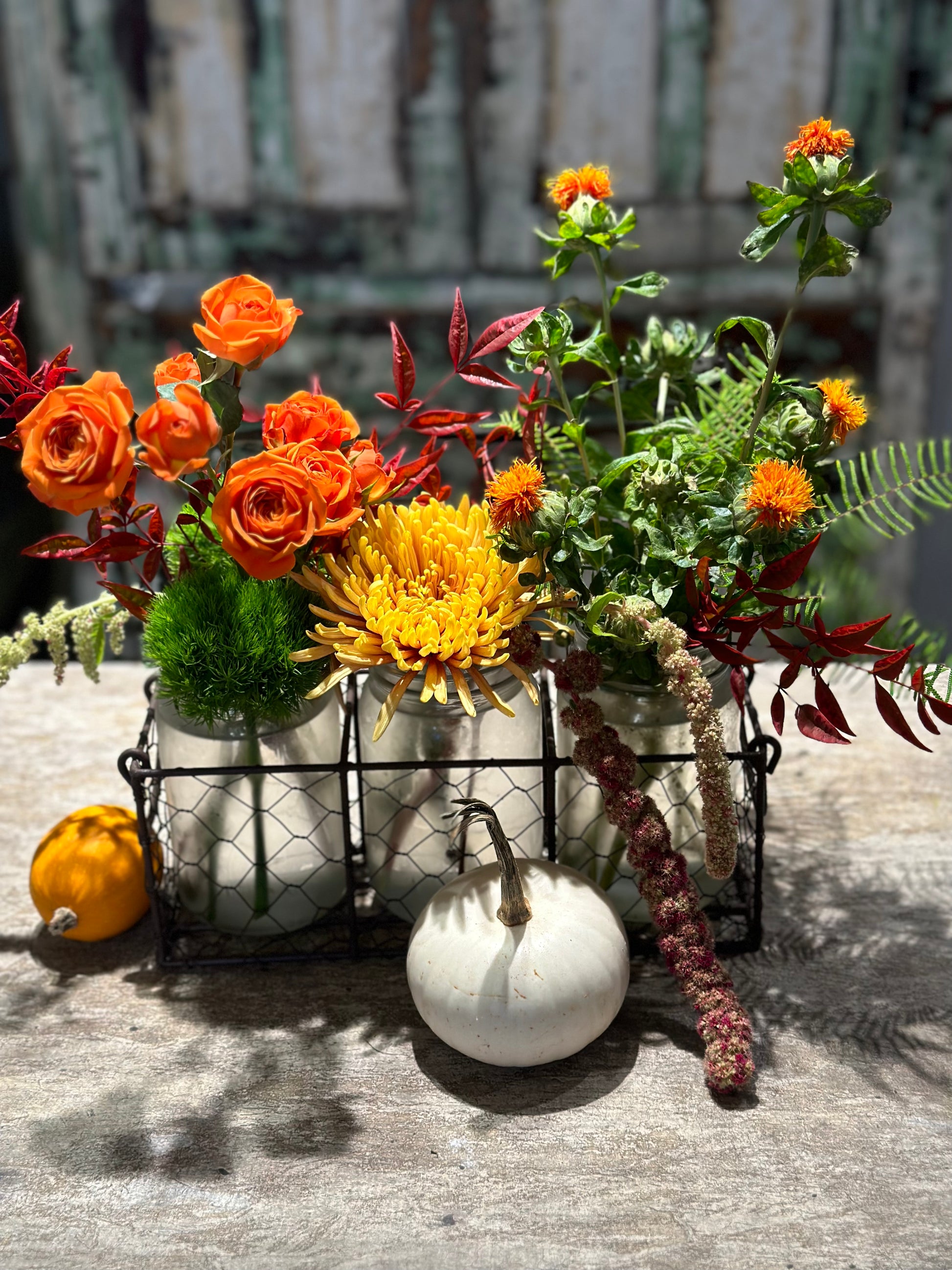 Rustic container with unique trio grouping of all the best Fall has to offer.